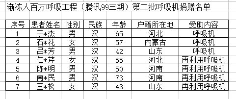 漸凍人百萬呼吸工程(三期)或(騰訊99二期)第三批受助患者名單