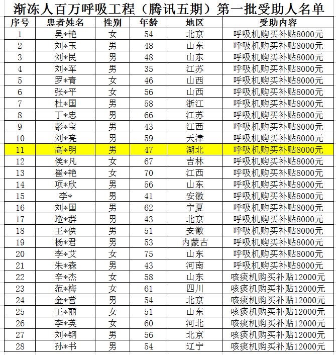 漸凍人百萬呼吸工程(騰訊五期)首批受助人名單