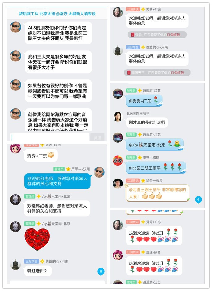 天氣漸涼,東方絲雨漸凍人(ALS)聯(lián)盟群病友交流熱度卻絲毫不減。著名歌手韓紅的加入,讓本就熱鬧的漸凍人(ALS)聯(lián)盟群,愈發(fā)地躁動了起來。也許是幸福來的太突然,有的病友還半信半疑地問:韓紅老師?以至于王麗平醫(yī)生不得不一再確認(rèn):剛才真的是韓紅老師。病友們興奮、激動之余,紛紛發(fā)來信息:歡迎韓紅老師,感謝您對漸凍人群體的關(guān)心和支持!