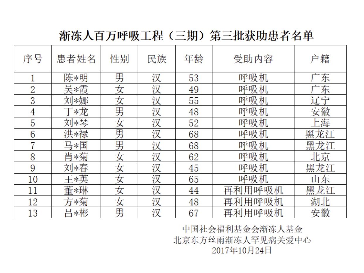 漸凍人百萬呼吸工程(三期)或(騰訊99二期)第三批受助患者名單