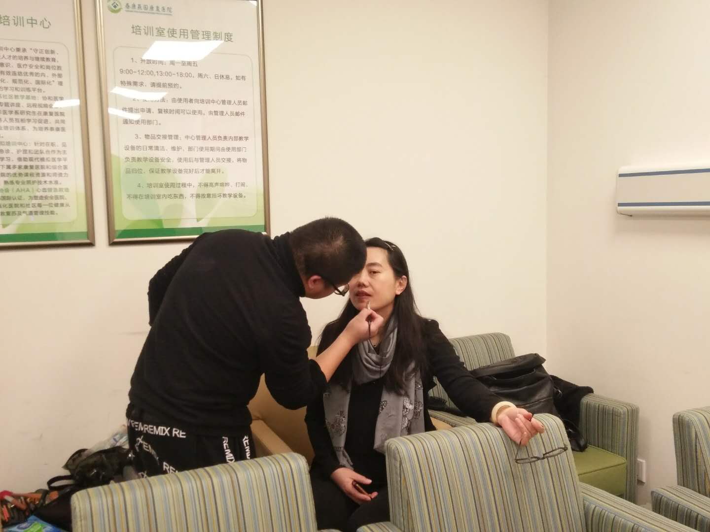 工作人員利用間隙時間畫個小妝,準備美美的迎接家人