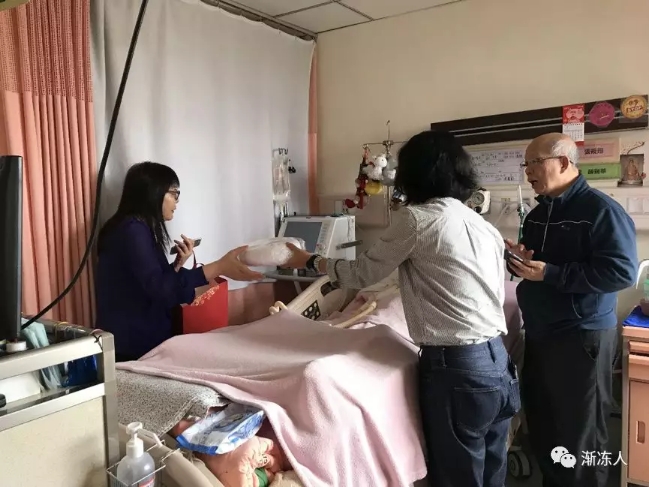 代表團(tuán)在臺灣漸凍人協(xié)會常務(wù)監(jiān)事游淑華(左一)、社工部主任蘇麗梅(左二)的陪同下探望曙光病房的病友。