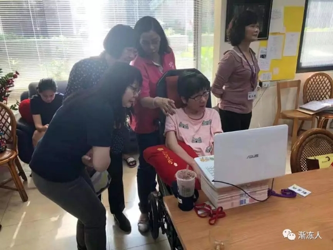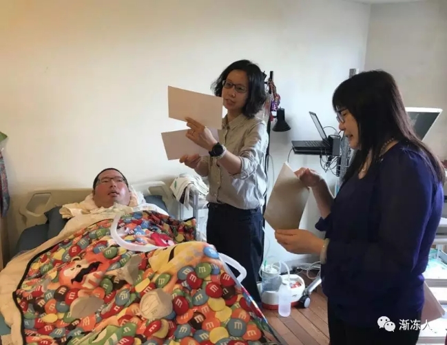 漸凍人陳銀雪(臺灣漸凍人協(xié)會常務(wù)理事,留美博士)來到曙光病房,用拼音板與代表團(tuán)成員交流。