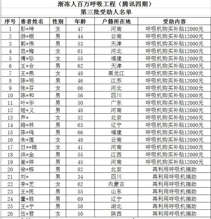 漸凍人百萬呼吸工程(騰訊四期)第三批受助人名單