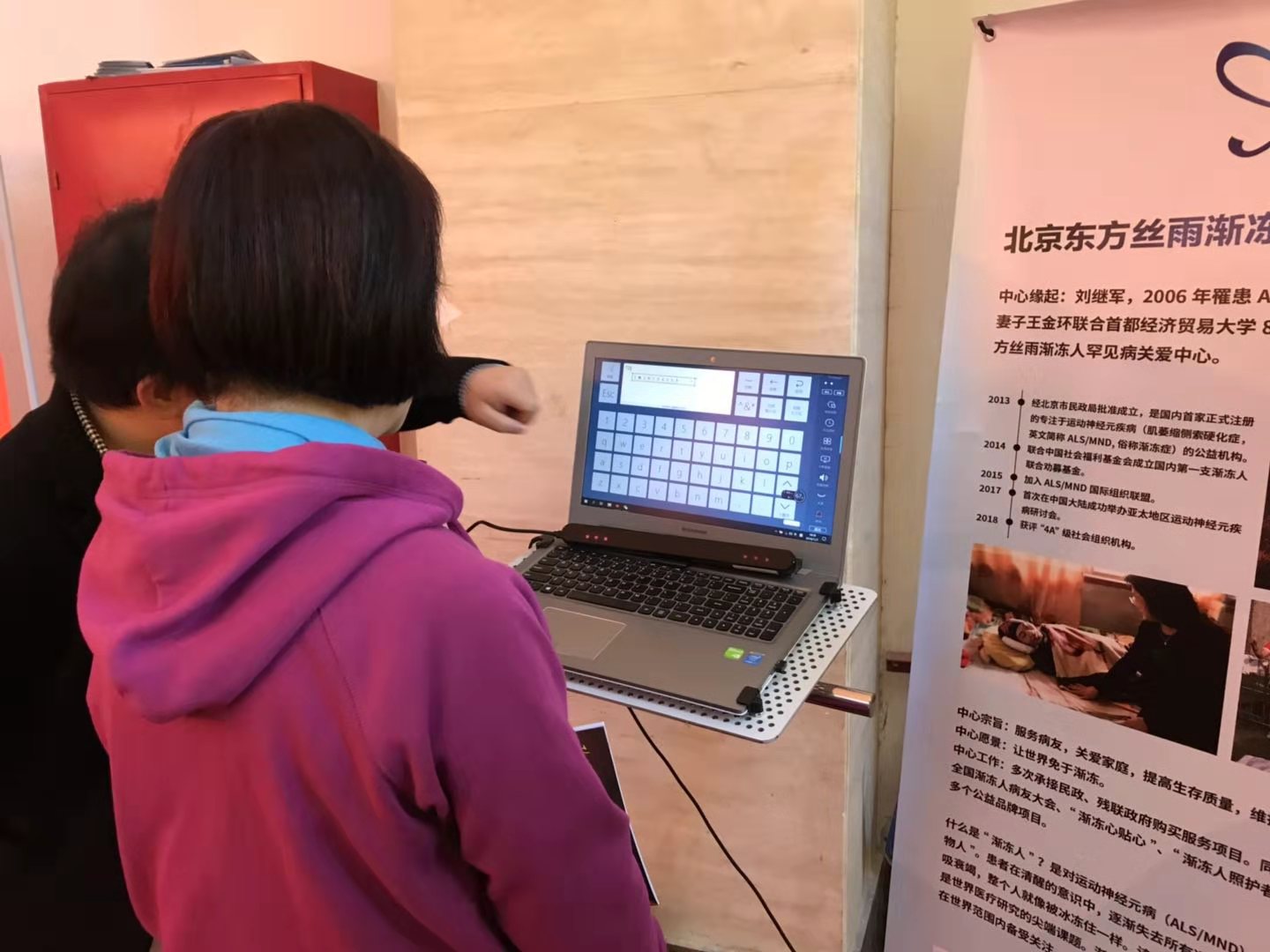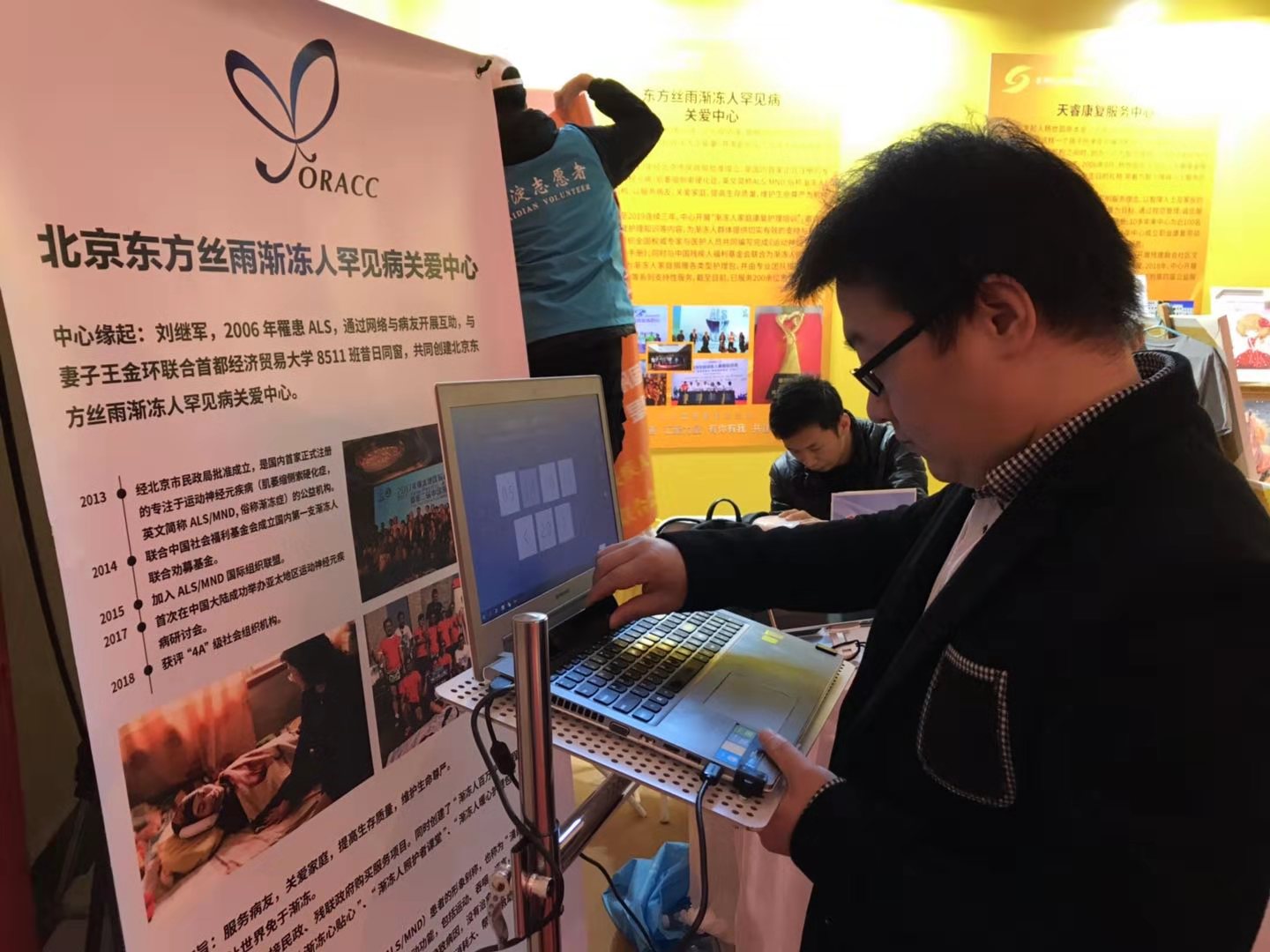 東方絲雨作為8家受邀出席展會(huì)的機(jī)構(gòu)之一,在活動(dòng)現(xiàn)場(chǎng)展示眼控儀等漸凍人輔具,并做公益項(xiàng)目推介,展位吸引了眾多觀展群眾駐足參觀互動(dòng)。