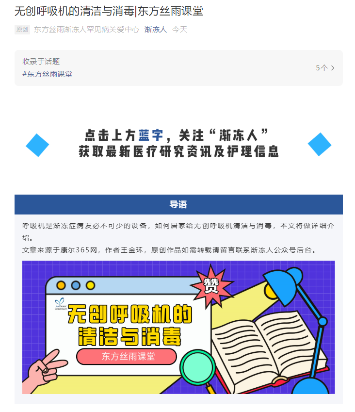 在設(shè)備捐贈(zèng)的同時(shí),我們了解到更多病友對(duì)居家護(hù)理和設(shè)備使用維護(hù)方面的困難。北京東方絲雨漸凍人罕見(jiàn)病關(guān)愛(ài)中心運(yùn)營(yíng)“漸凍人”公眾號(hào)特開(kāi)通版塊東方絲雨課堂,持續(xù)為病人提供居家護(hù)理、日常維護(hù)病人生命設(shè)備等相關(guān)知識(shí),希望大家持續(xù)關(guān)注。近期推送文章《無(wú)創(chuàng)呼吸機(jī)的清潔與消毒|東方絲雨課堂》更是獲得了多位病友的點(diǎn)贊和學(xué)習(xí)。