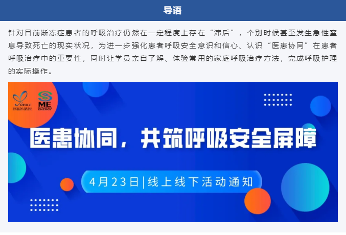 現(xiàn)定于4月23日舉辦“漸凍人康復(fù)護(hù)理金種子工程——醫(yī)患協(xié)同,共筑呼吸安全屏障”培訓(xùn)班。具體安排如下。