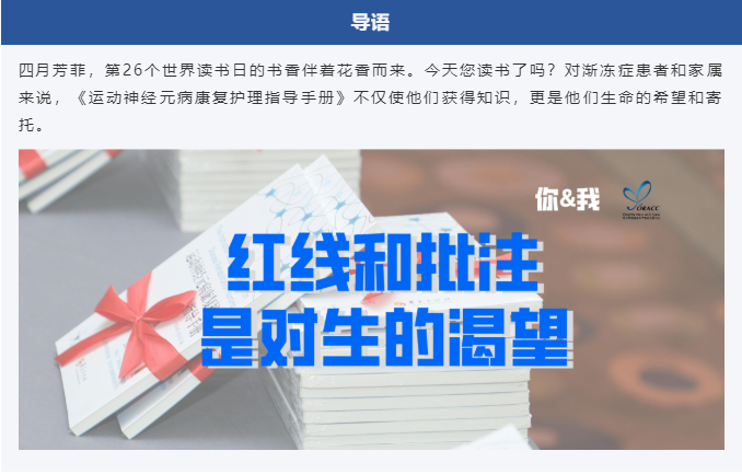 漸凍癥,隨著病程的發(fā)展家屬對病人的付出決定了病人生活的質(zhì)量。通過讀書,不僅能夠了解相關的醫(yī)學知識,還能更有效的與病人溝通,同時對今后生活秩序的重建有了更明確透徹的規(guī)劃。