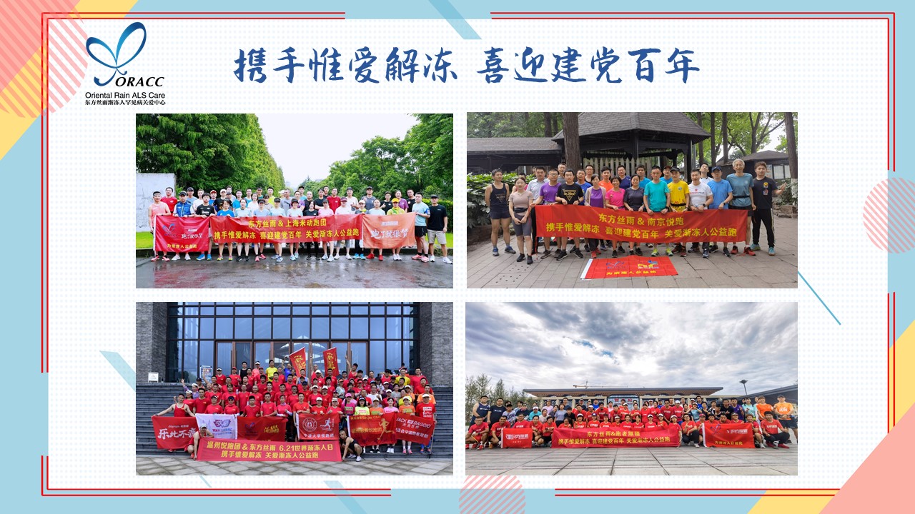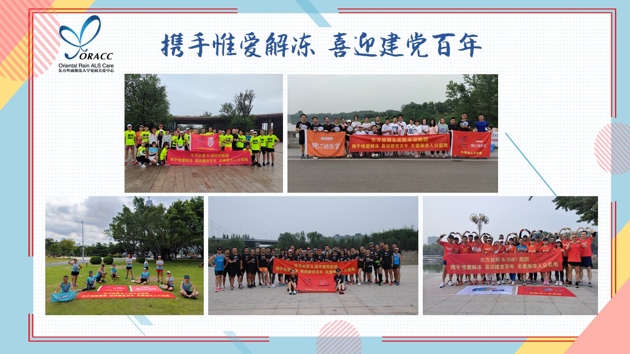 每逢6.21世界漸凍人日這一天,全球各地都舉辦各種活動,呼吁大眾關(guān)注、關(guān)愛漸凍人這一特殊而罕見的群體。今年的第21個世界漸凍人日,恰逢迎接中國共產(chǎn)黨建黨百年誕辰,為了更有意義的迎接這兩個特殊的日子,我中心舉辦了“攜手惟愛解凍 喜迎建黨百年”百人、百團(tuán)、百公里公益跑活動,匯聚愛心傳遞愛的力量。