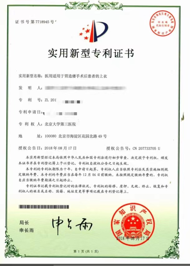 為了減少患者在生活中因PEG管而覺得十分尷尬,已研發(fā)出了適用的上衣——醫(yī)用適用于胃造瘺手術(shù)后患者的上衣(如圖所示)。