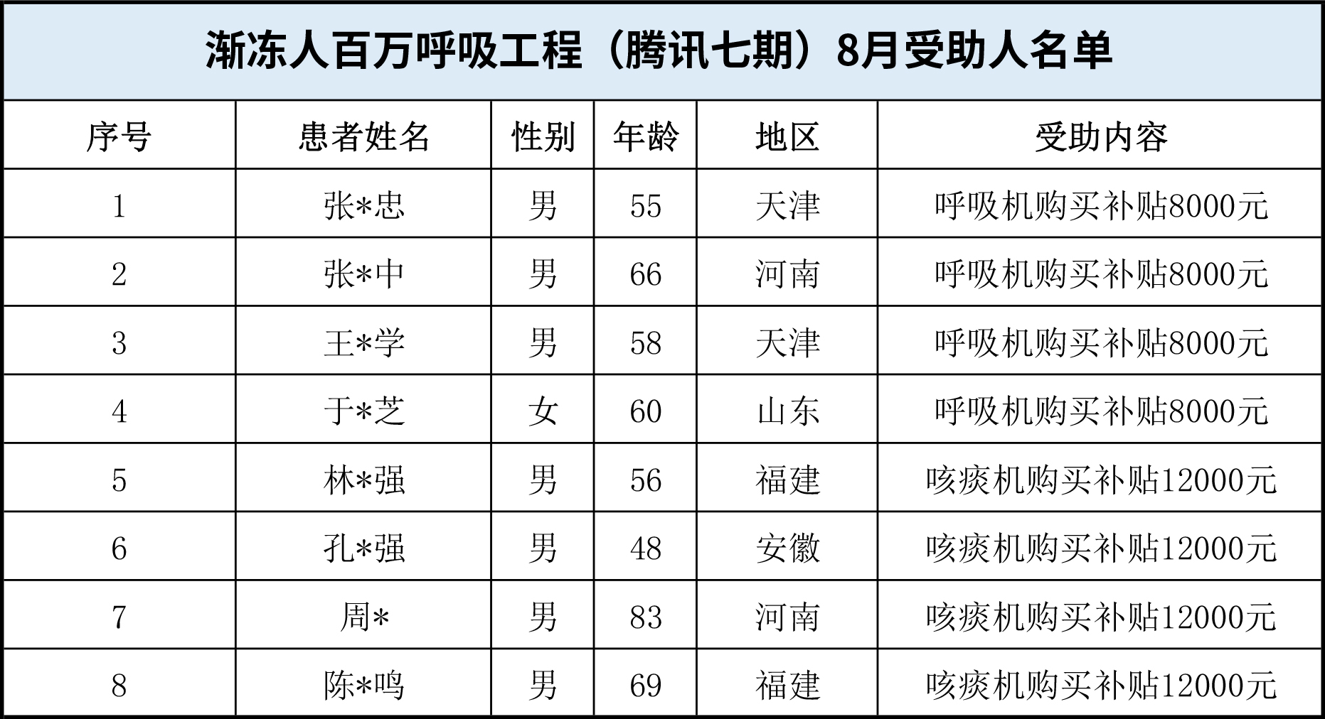 經(jīng)我中心審核通過,項目于8月執(zhí)行期間為4位患者發(fā)放無創(chuàng)呼吸機購買補貼,為4位患者發(fā)放咳痰機購買補貼。兩項補貼共計發(fā)放8萬元。受助人名單如下:
