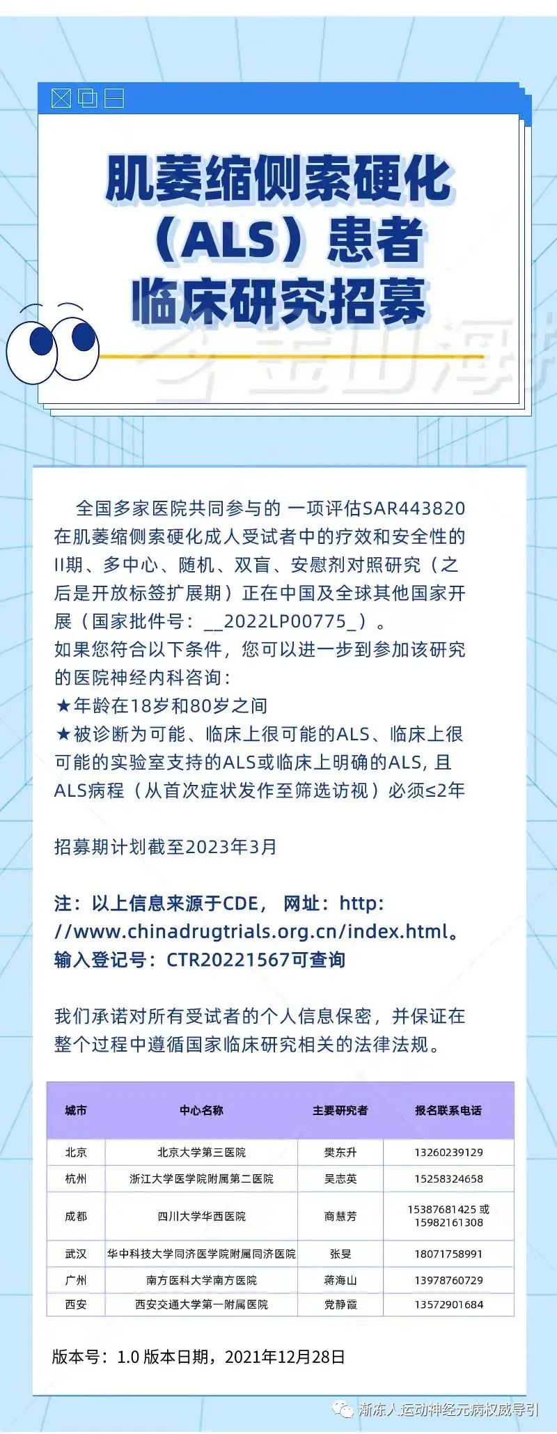 全國多家醫(yī)院共同參與的一項評估SAR443820在肌萎縮側(cè)索硬化成人受試者中的療效和安全性的 II期、多中心、隨機(jī)、雙盲、安慰劑對照研究(之后是開放標(biāo)簽擴(kuò)展期)正在中國及全球其他國家開展(國家批件號:2022LP00775)。有意愿的病友,可參照招募條件,根據(jù)自身狀況參與。