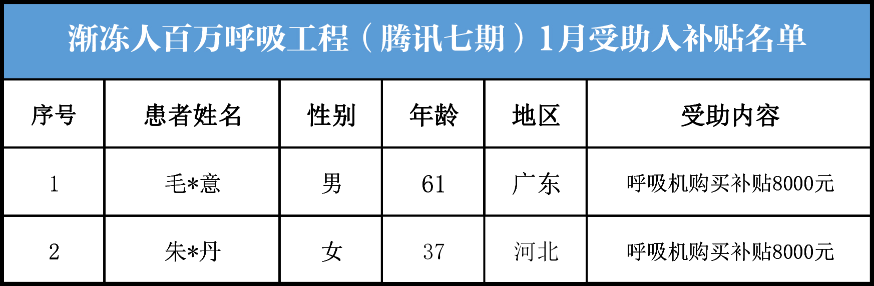 春暖花開,破冰前行。感謝各位愛心人士對漸凍人百萬呼吸工程項目的支持和關(guān)心,本項目2023年1月、2月共計為4名患者發(fā)放呼吸機購買補貼共計32000元。支出明細如下: