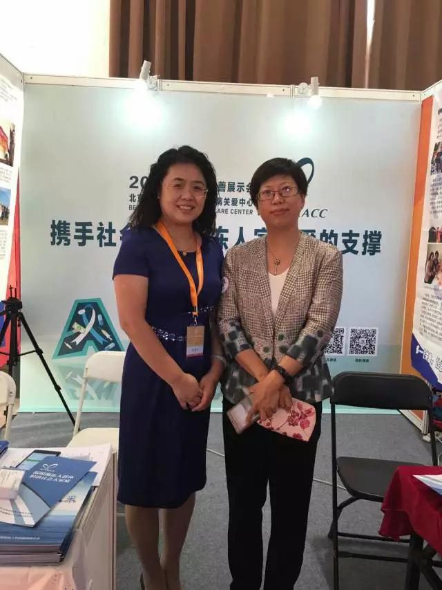 北京市民政局副局長董明慧(右一)在東方絲雨漸凍人關(guān)愛中心展位指導(dǎo)工作